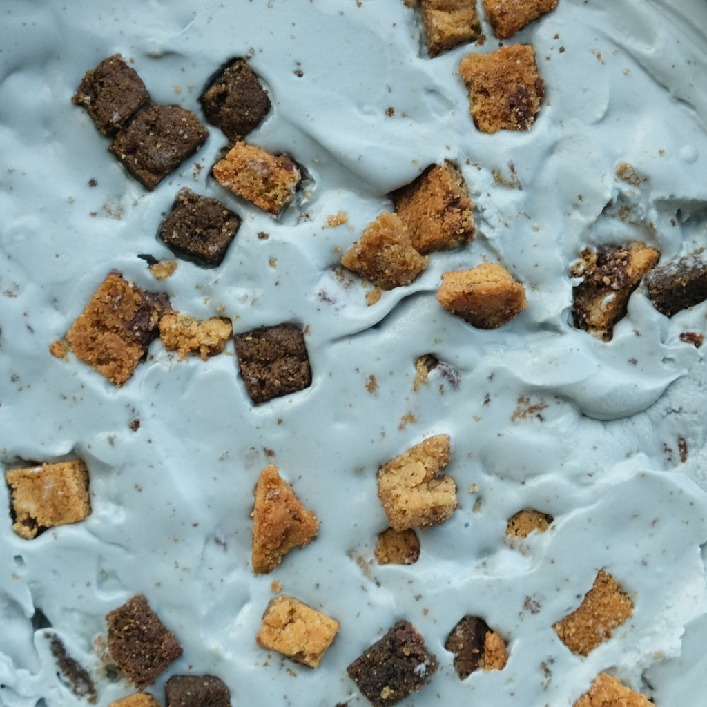 Turning our day old cookies into a fun ice cream flavour because no one likes waste. A blue sweet cream ice cream (coloured with butterfly pea powder), loaded with chunks of homemade chocolate chip cookies, brown butter skor sea salt cookies, and hojicha cookies.